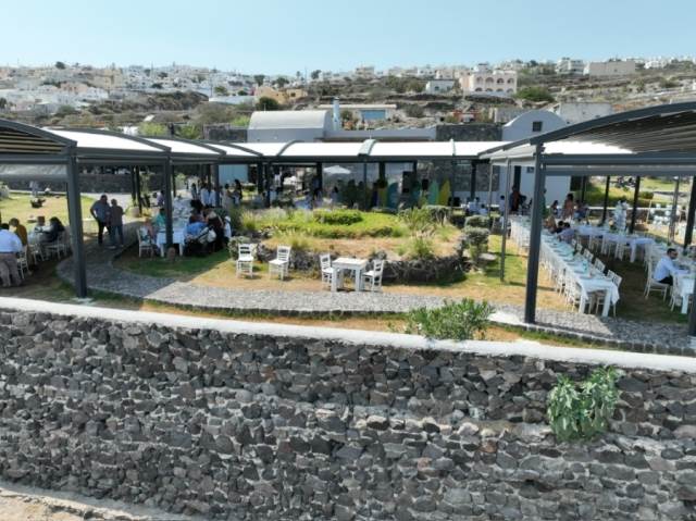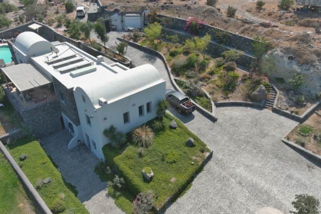 #### Outdoor Areas:At the entrance of the building:- **2 Installed shade pergolas, made of Iroko wood, 20 m².**- **2 boiler rooms with 3 built-in tanks (2 of 20 cubic meters each/The 3rd, 10 cubic meterscollects rainwater).**- **Installed well, 186 meters deep, pumps water with a 4-horsepower three-phase pump, fillingone of the two tanks used for the pool, the lake, and the irrigation of the estate.**- **Professional reverse osmosis system. Desalinates and filters water, making it drinkable, fillingthe 2nd tank.**- **All gas systems for the main house are installed for use in the fireplace and kitchen with allsafety systems required by law.**- **The western central entrance is a handmade wooden door, castle-style, with access to thenew peripheral road of Fira, without parking space.**- **The northeast entrance of the estate has a 500 kg metal sliding door, wireless, with apedestrian door.**- **At the northeast entrance is the parking lot that can accommodate 25 cars or three 50-seatbuses and 7 cars. It has an open metal pergola with a shade for 2 vehicles.**- **The entire parking area is paved with cobblestone. It has access to the outdoor event space,separated by a 20*5 meter wall, 70 cm thick, with two faces and a castle-style woodenentrance.**- **The entire estate is fenced with a stone wall.**- **There are paths, squares, and stone cobbled roads.**- **The entire reception area, 400 m², is paved with Karistos stone. It has a wooden dance floor of50 m². It is covered with a state-of-the-art aluminum pergola, uniquely designed, 400 m²,electrically opening, with integrated LED lighting, Sonfi motor, adjustable with a remote control orwith the smart home system.**- **Side transparent manual awnings for protection from all weather conditions.**